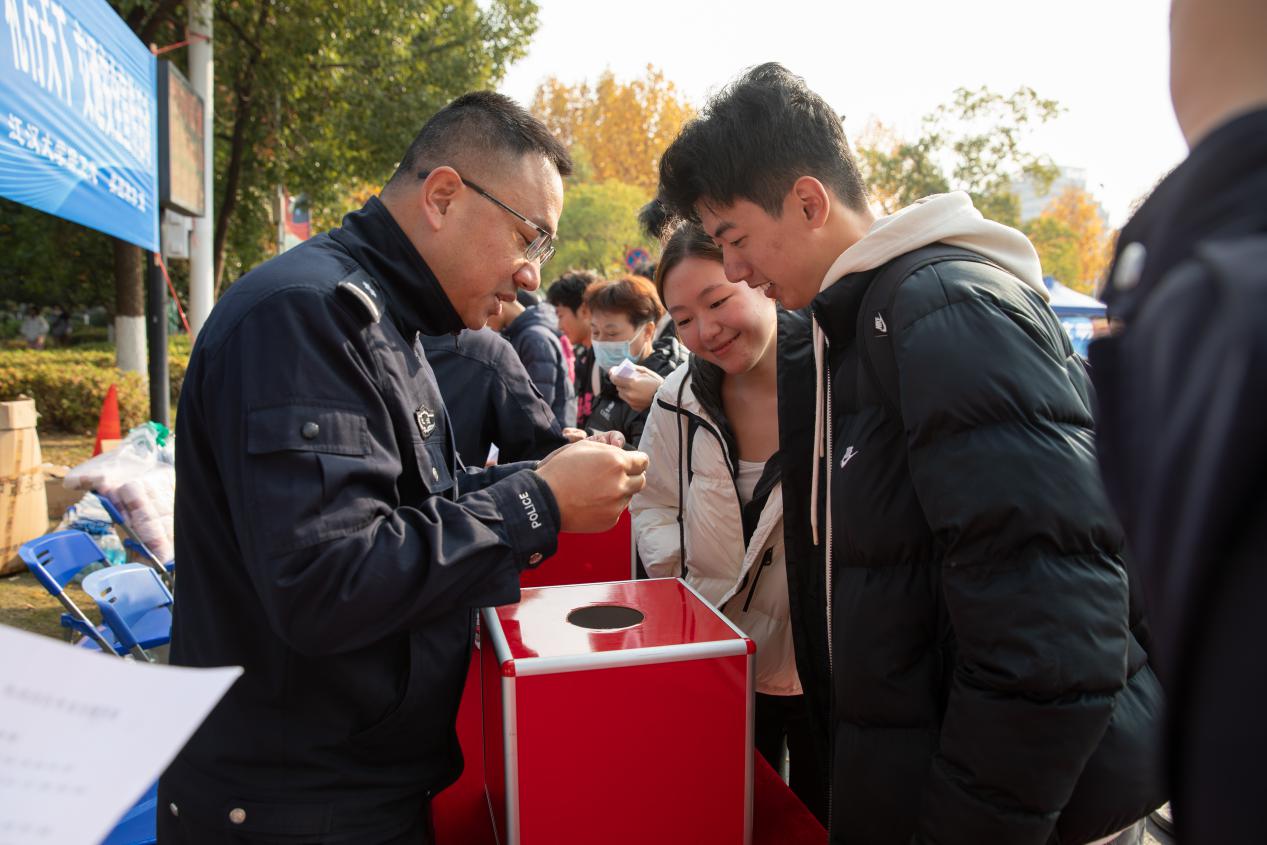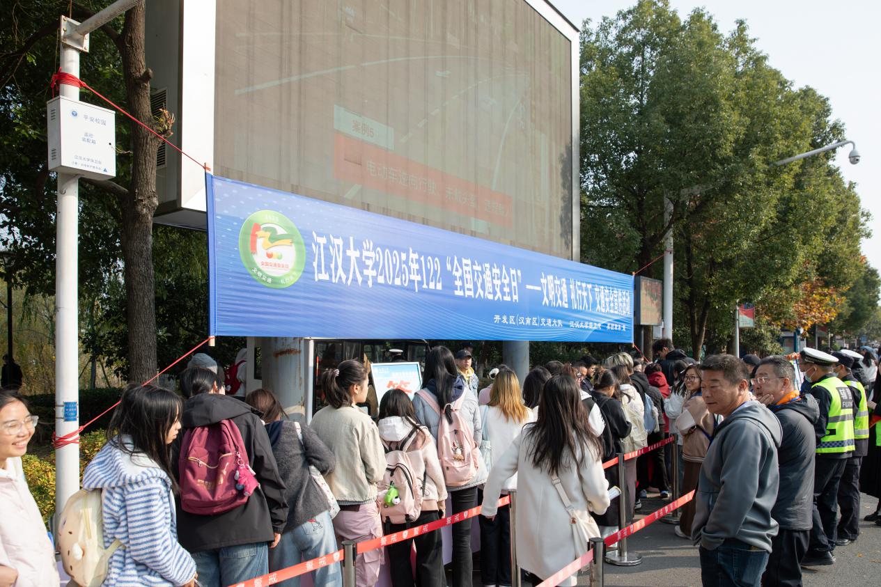 为进一步增强我校师生员工的道路交通安全法律意识与文明交通意识,积极倡导“出行遵守交规,礼让体现文明,拒绝安全隐患,远离事故伤害”的理念,共同营造平安和谐的校园交通环境,在12月2日“全国交通安全日”到来之际,我校保卫处联合武汉经济技术开发区(汉南区)交通大队,在校内开展了以“文明交通,礼行天下”为主题的道路交通安全宣传活动。